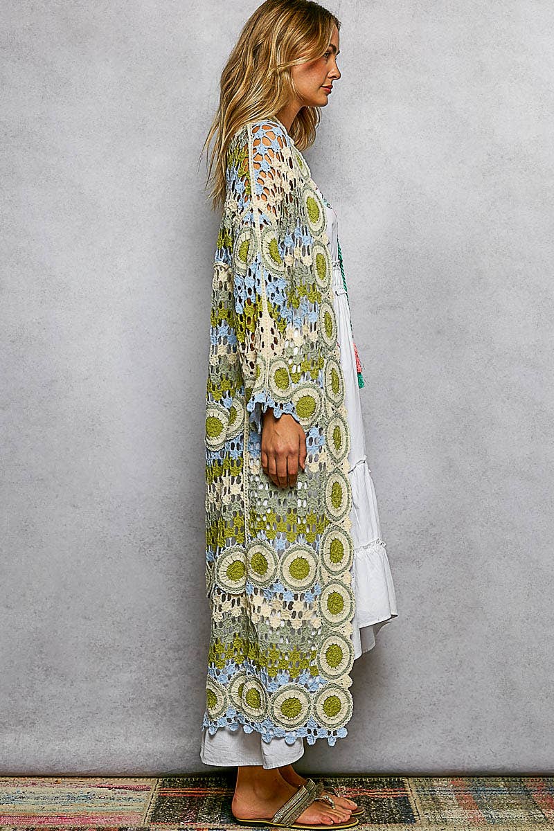Designed in long sleeve roomy fit cardigan in crochet with open knitted, colorful stripe pattern, circle-shaped border accent and scalloped edge